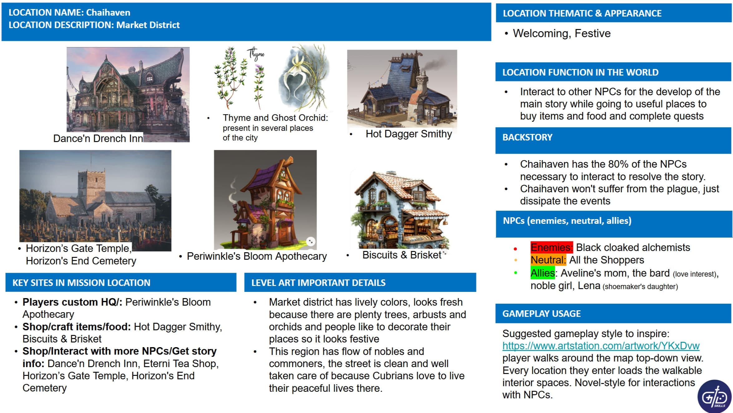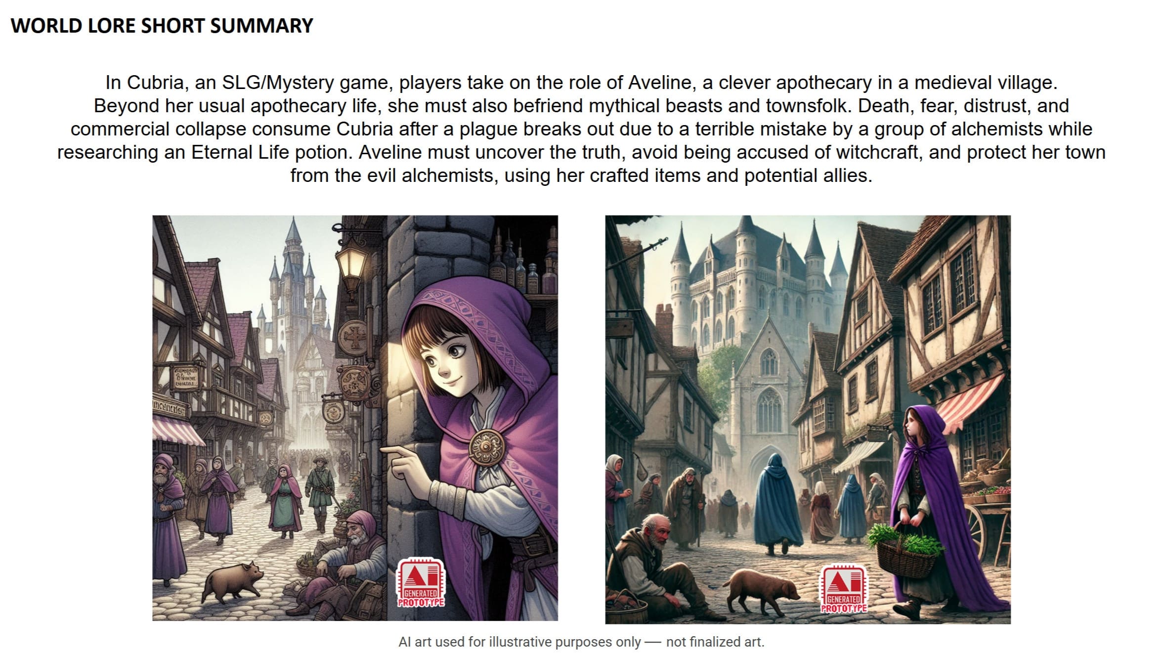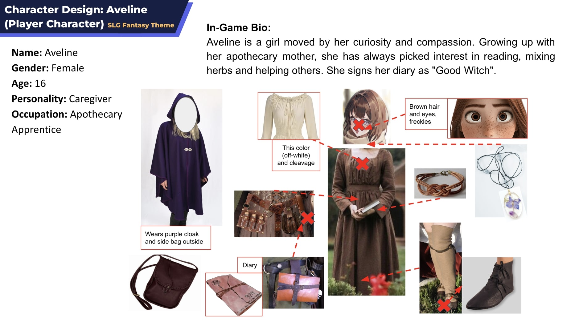 Designed an enthusiastic player character Aveline as an apothecary apprentice that amongst living a cozy life in Cubria also finds herself in the position to save the whole city from a plague while avoiding facing trial accused of witchcraft.