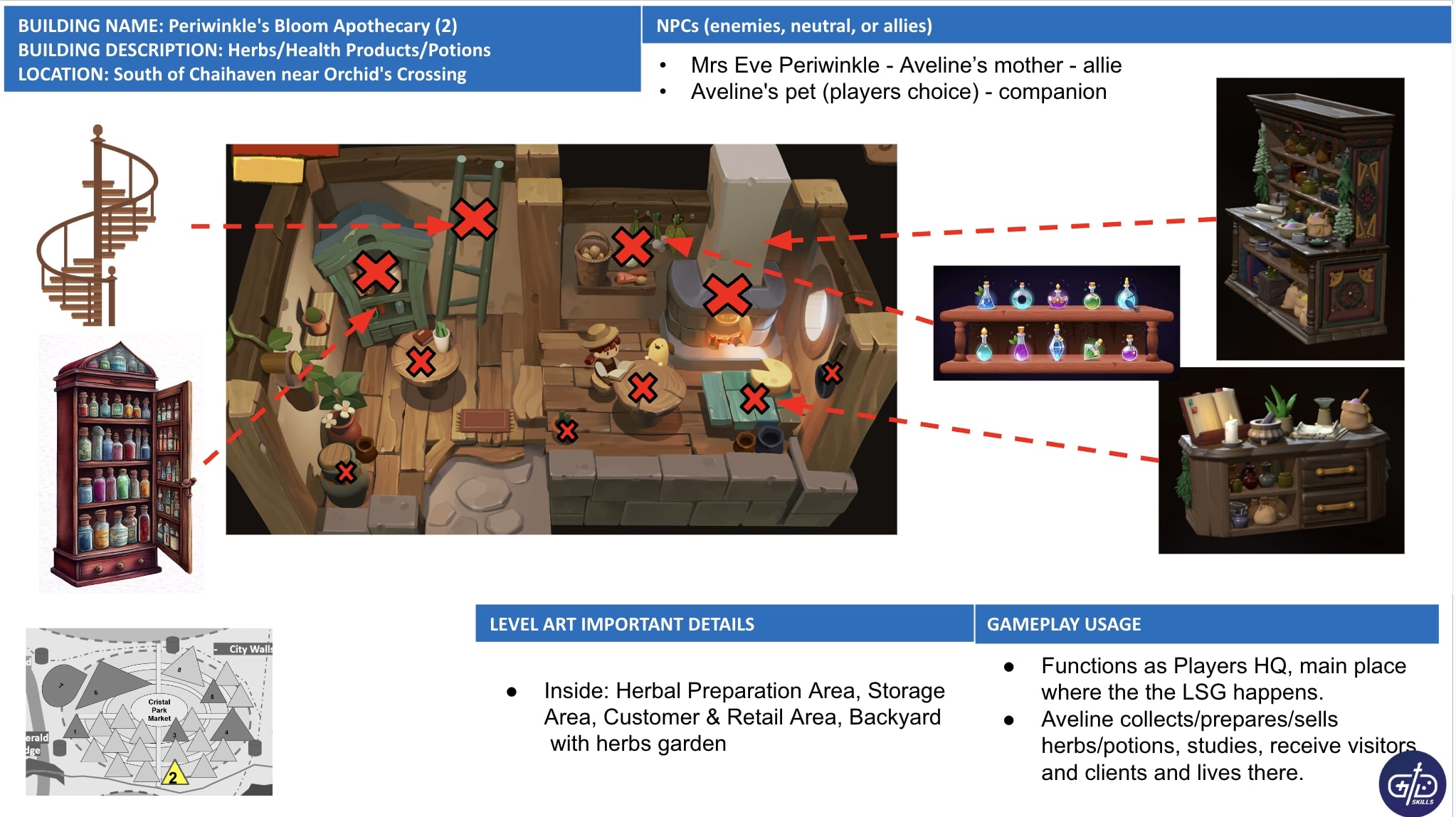 I created Perinwinkle’s Bloom Apothecary as the player character’s home base, where they’ll rest, craft, keep storage, study, and receive narrative driven information from Aveline’s mother.