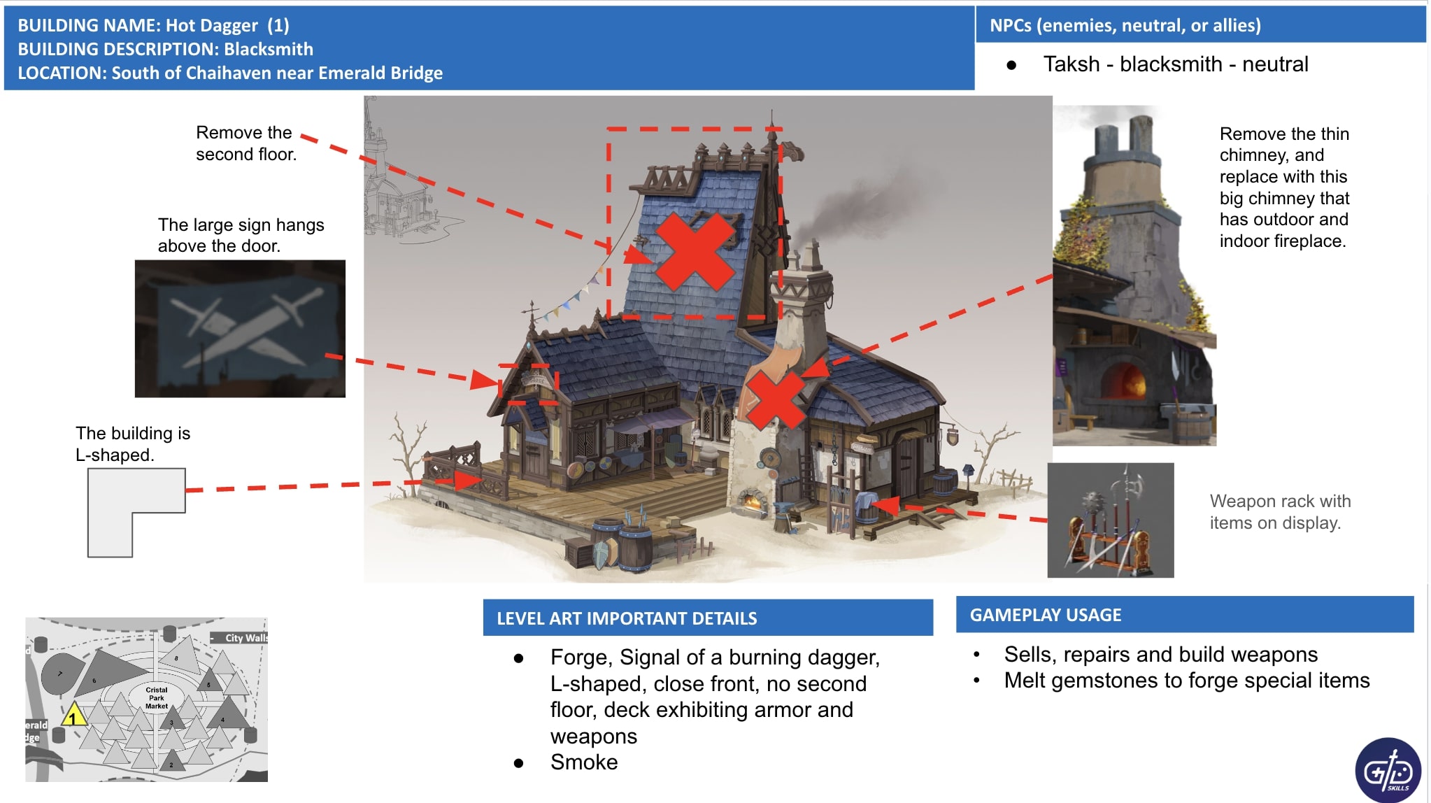 I created Hot Dagger as the Blacksmith’s building — a place where the player can take on material fetch quests, as well as buy and repair weapons.