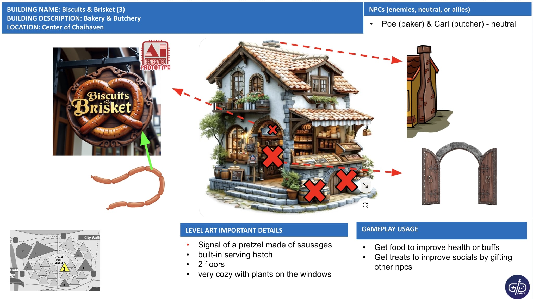 - Lore Curiosity: The building is run by the couple Poe and Carl — a baker and a butcher, respectively. The name comes from their unique partnership and is marked by a sausage-shaped pretzel sign hanging over the door. It was Poe’s idea, Carl loved it. The shop is recognizable by its built-in serving hatch and overflowing flower boxes on the windows.