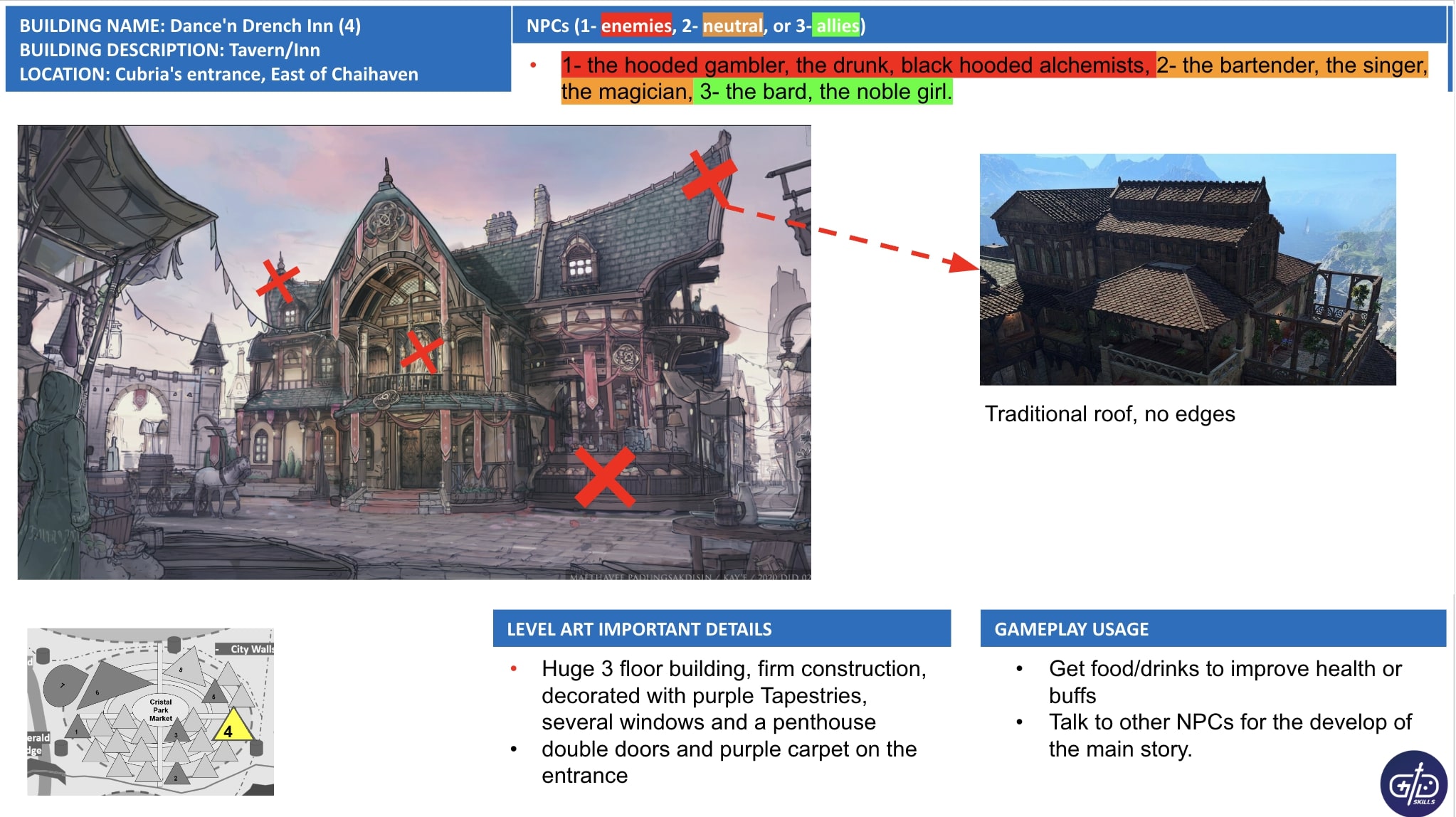I created Dance’n Drench Inn as a vibrant, three-floor Tavern located at the entrance of Cubria, east of Chaihaven. Player can stop by to grab food and drinks that restore health or offer temporary buffs, and more importantly, to interact with key NPCs that push the story forward.