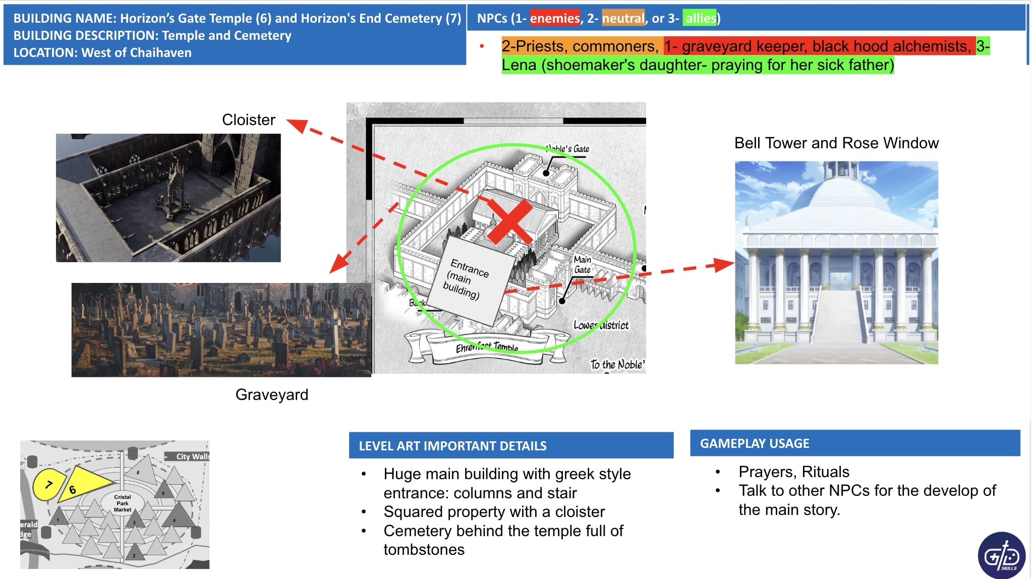 I created Horizon’s Gate Temple and Horizon’s End Cemetery as a Sacred Site located west of Chaihaven, where the faithful of the Celestial Path gather to honor the Sun God and Moon Goddess. The location plays a major role in the story, offering important interactions with key NPCs and being the place where the graveyard keeper and the secretive black-hooded alchemists hint at hidden activities.