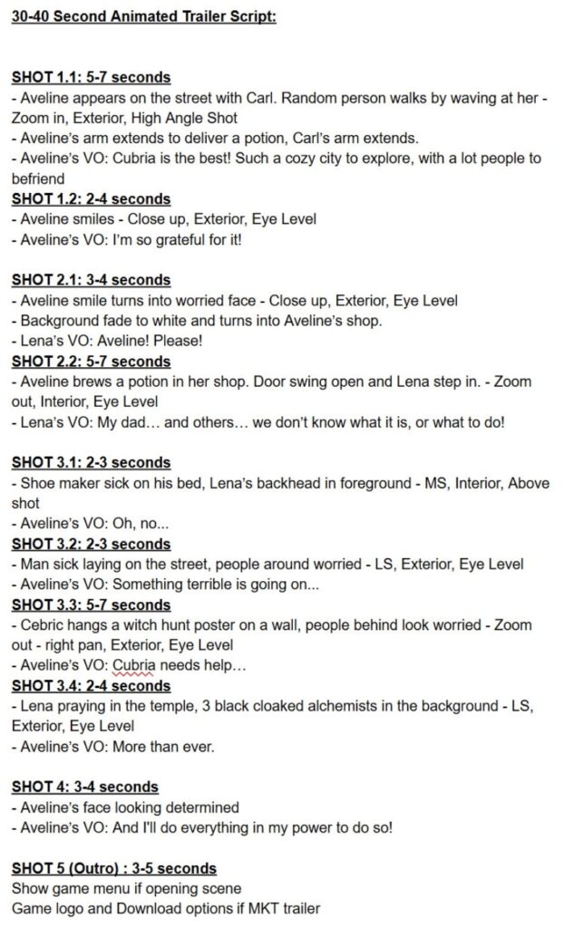 I wrote and storyboarded an intro sequence that can also be used as marketing piece where the player gets to know the main character Aveline, what is going on in Cubria and what will be their role in the game.