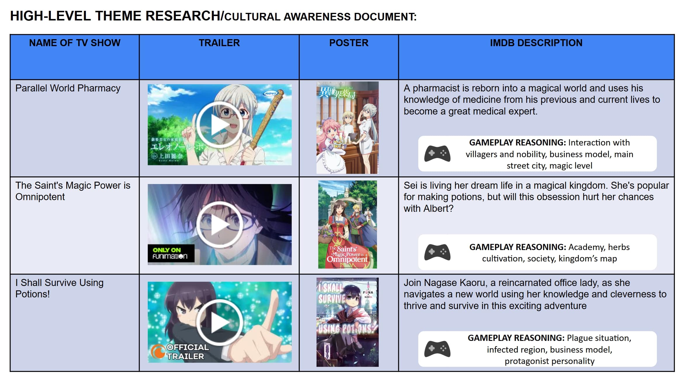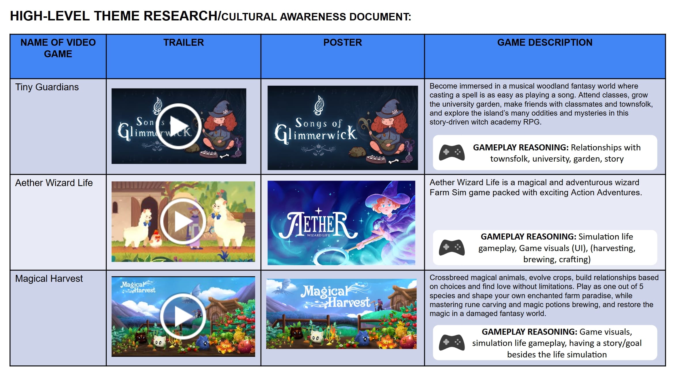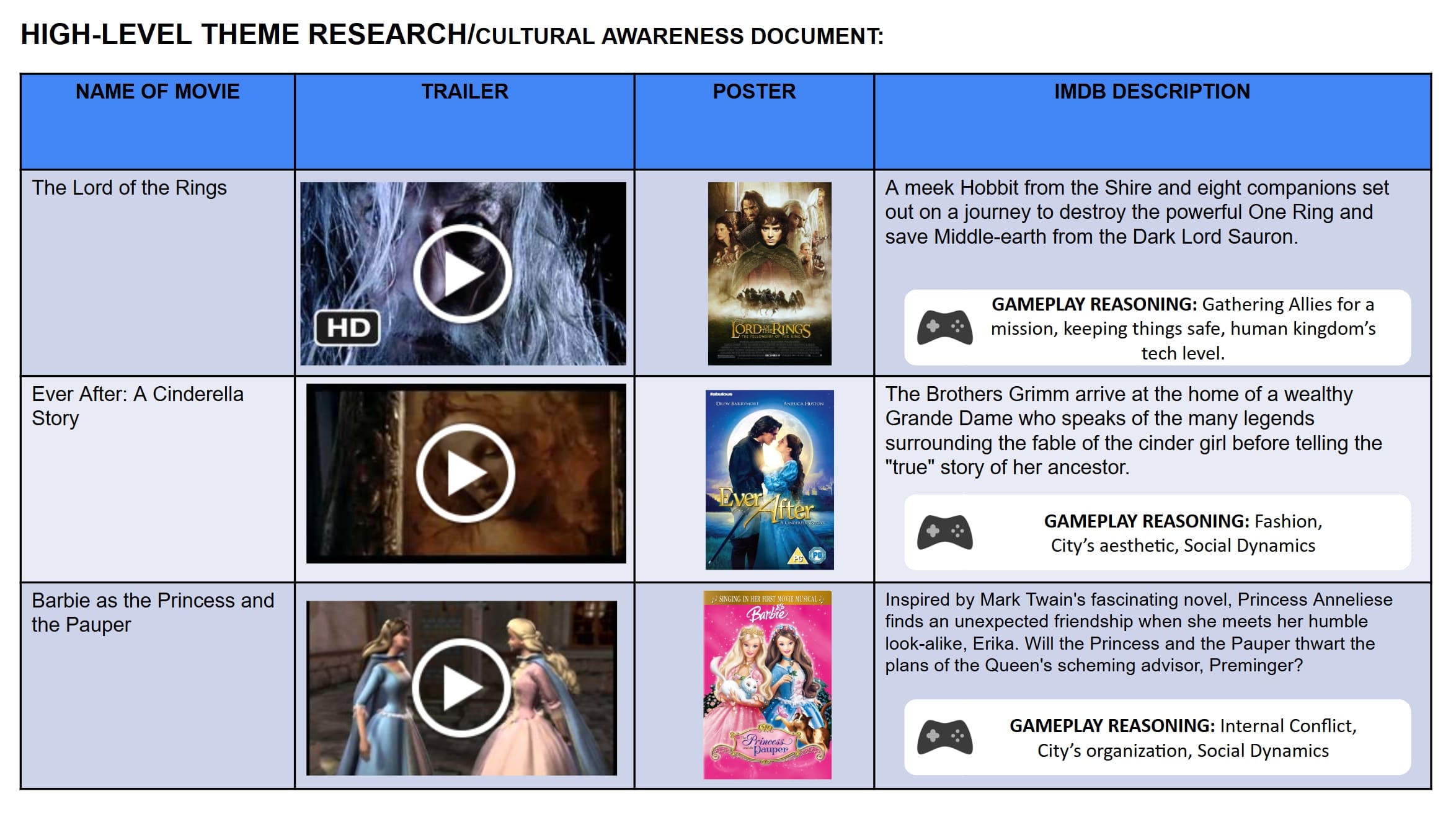 To achieve coherence, determine world-building, gameplay, market positioning, target audience, and competition, I researched and identified these fantasy references of visuals, medieval cities organization, limited levels of magic, social dynamics and relationships from