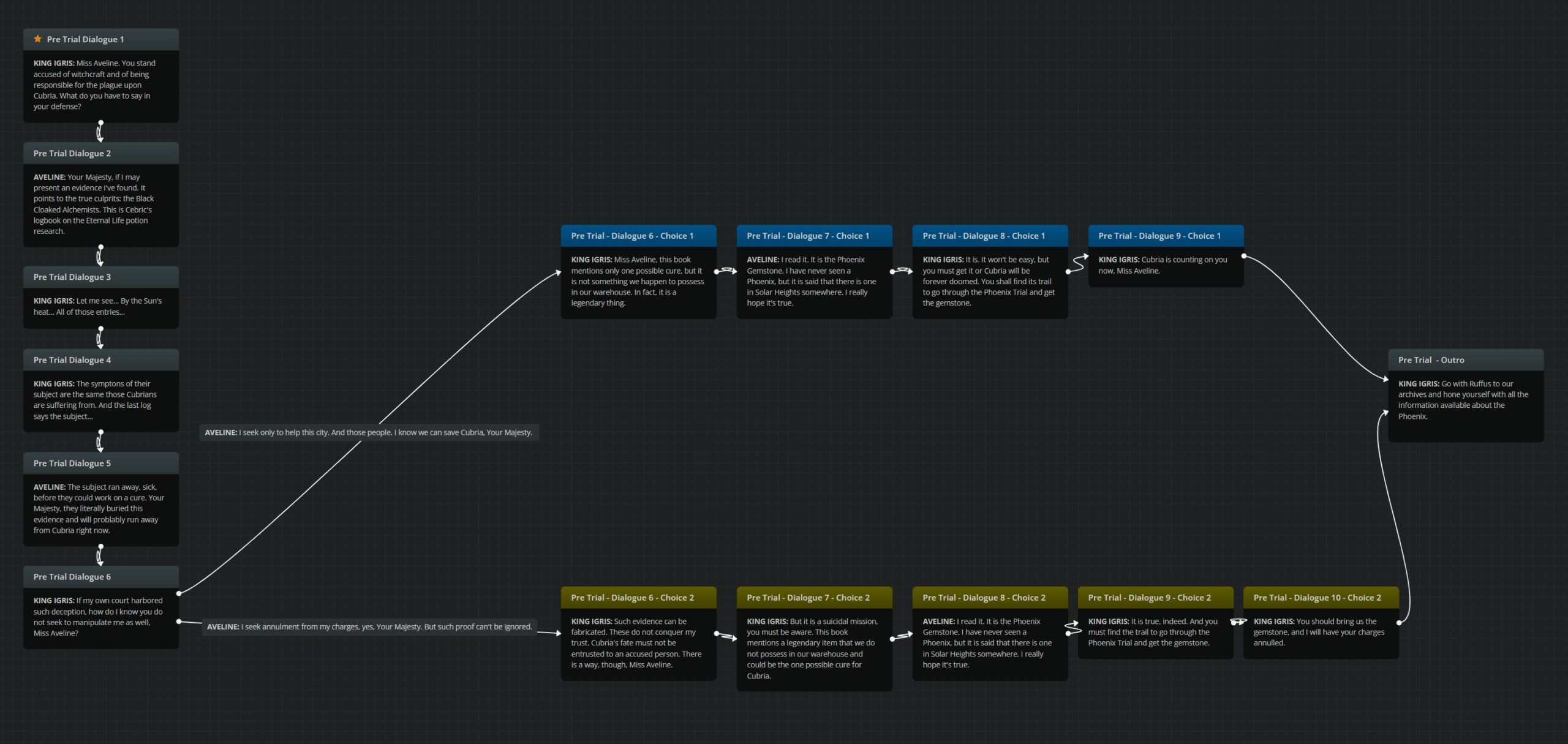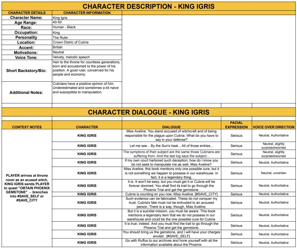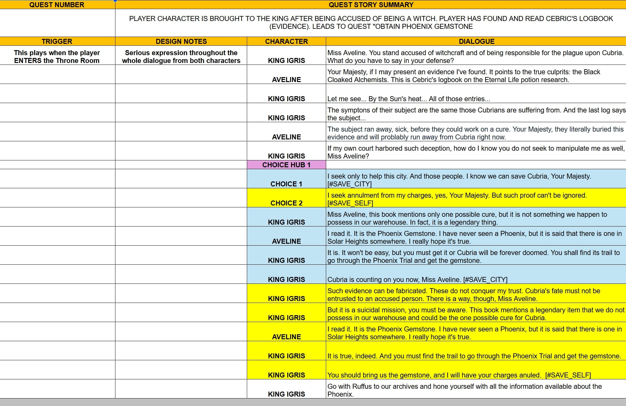 Designed branching dialogue tree and unique choice dialogue between the Player Character and King Character. I also made localization notes and the Portuguese transcription.
