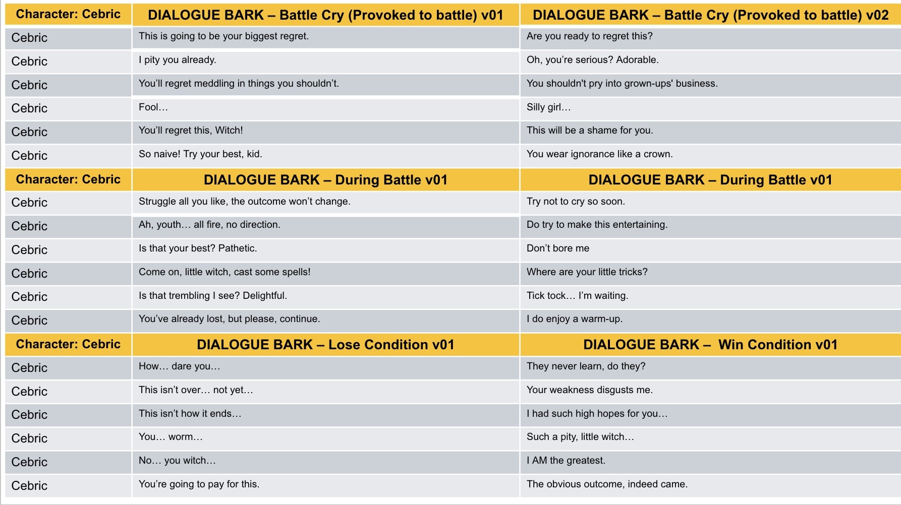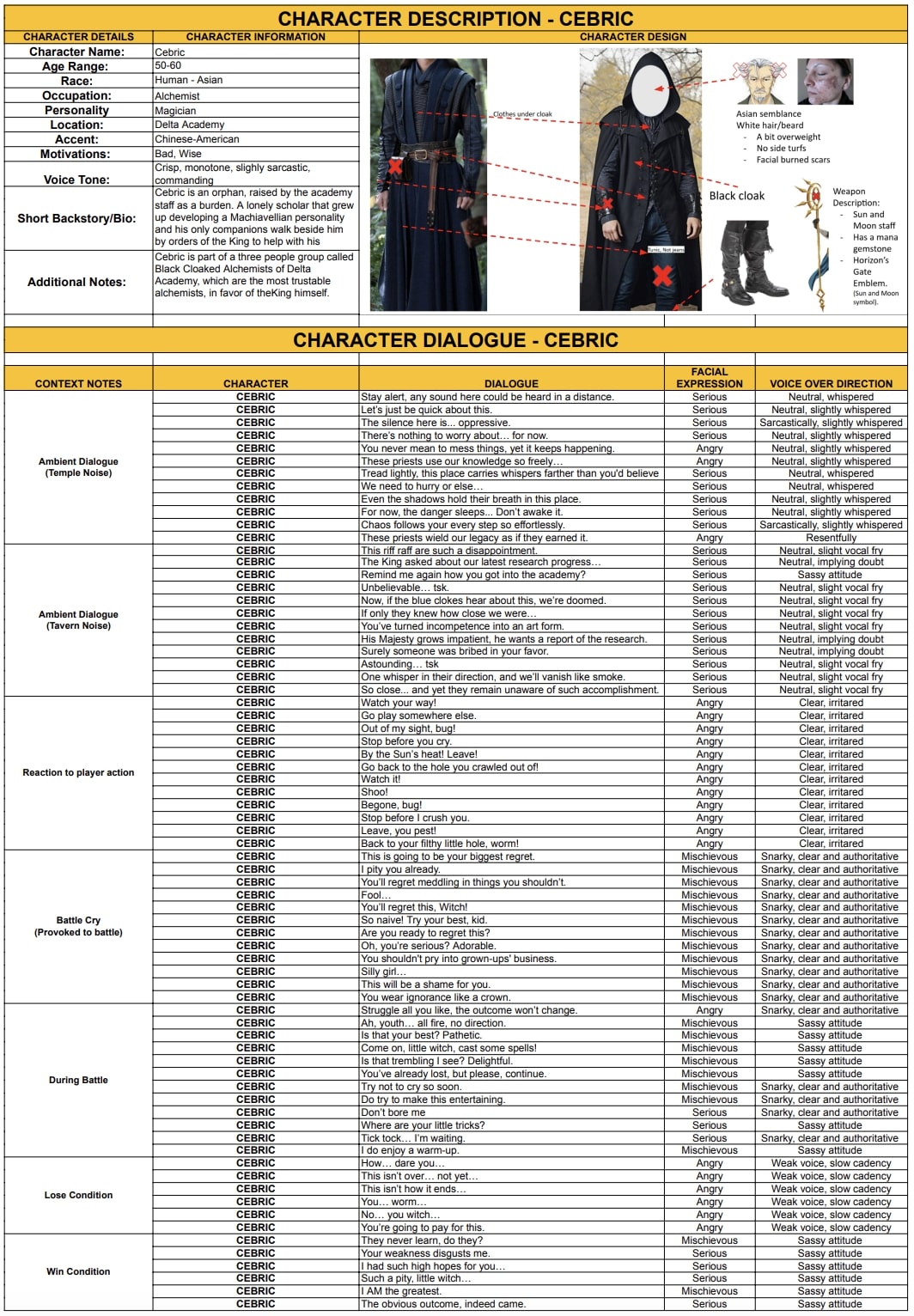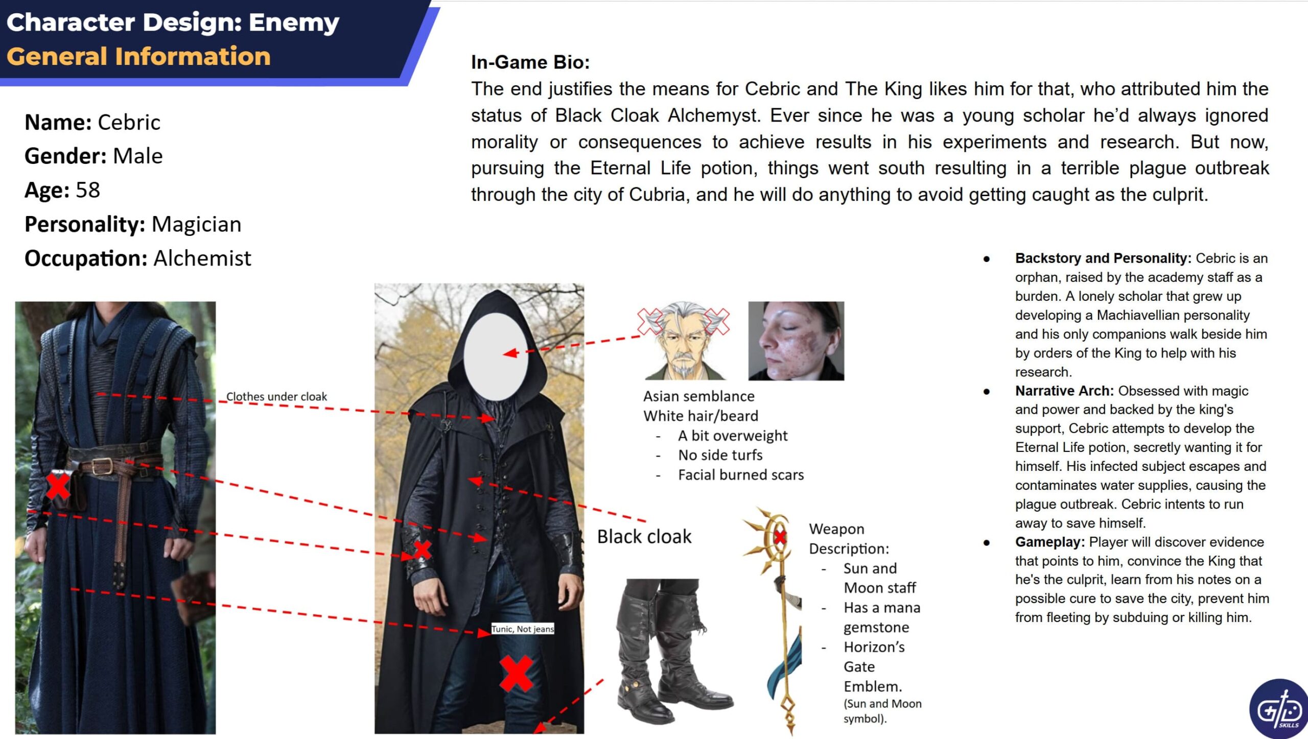 Designed a compelling main villain Cebric with unique backstory, motivation and arc to highlight the main characters qualities by being its polar opposite character.