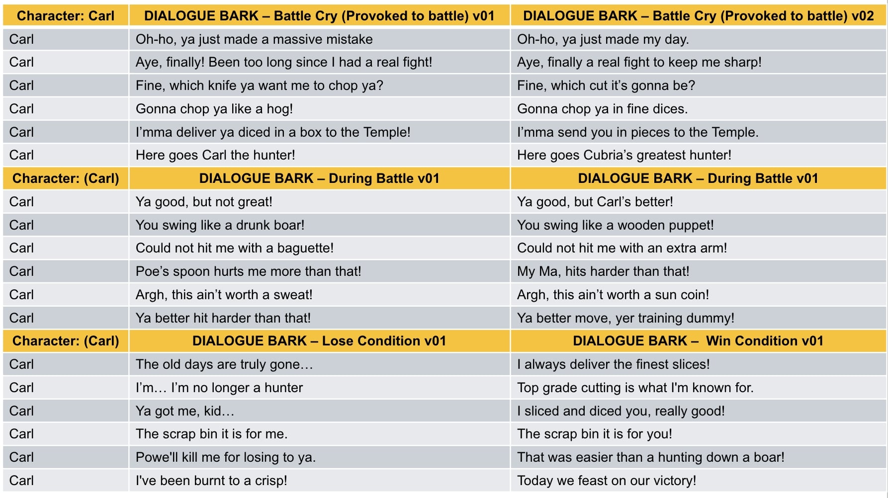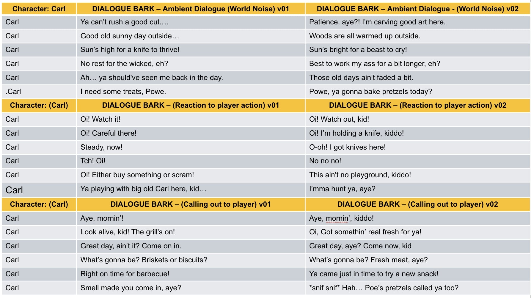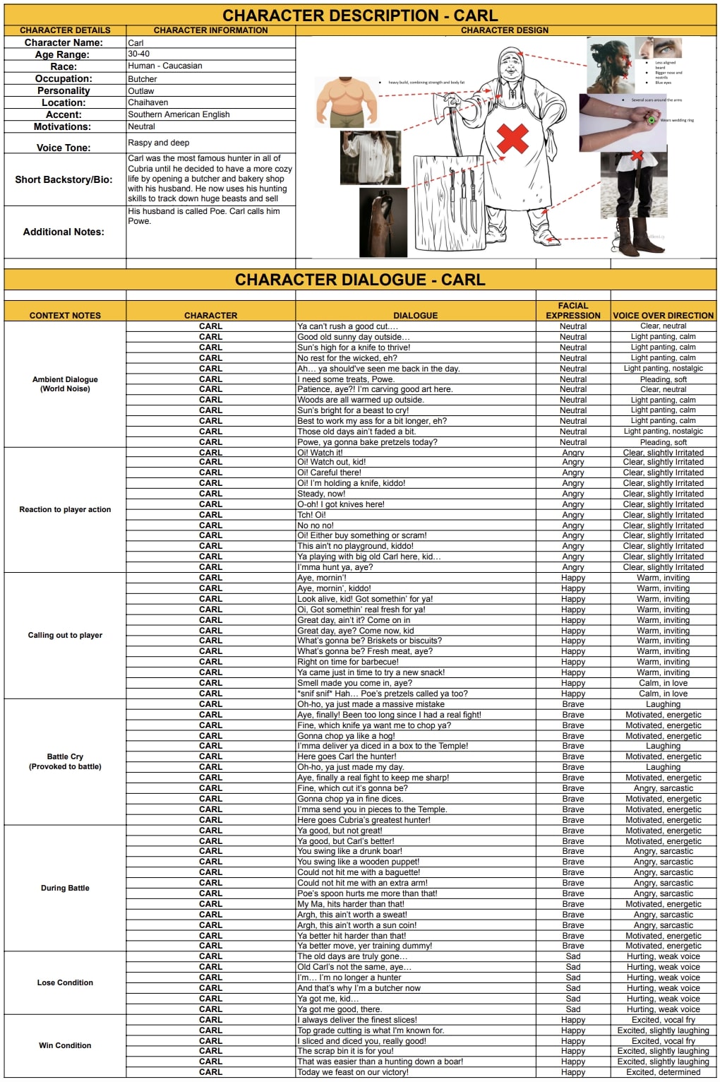 I did the character design, bio and barks of Carl, an unique companion butcher that contributes to the gameplay by: