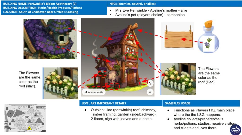- Lore curiosity: I chose to create Aveline’s family name inspired by the color periwinkle and implement a whimsical personality in her mother’s character and home that allows the player to engage with the narrative and apothecary simulation.